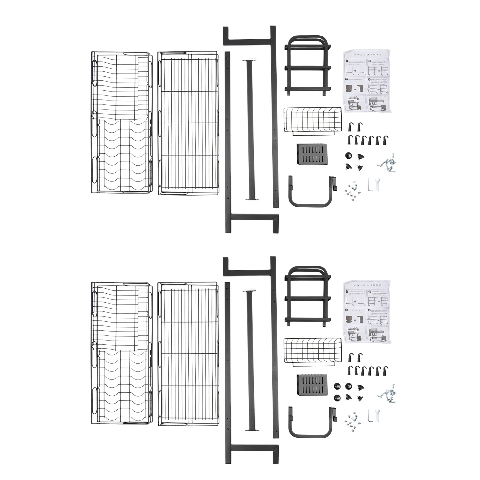 Large Storage Space: The different racks (plate rack, bowl rack, knife rack, chopping board rack, chopstick cage, sanitaryware basket) and 8 hooks can store bowls, plates, dishes and kitchen cleaning products separately. Meanwhile, the two separate compartments provide more convenience for categorized storage, and the top shelf can also be used as a shelf for different sizes of kitchenware.